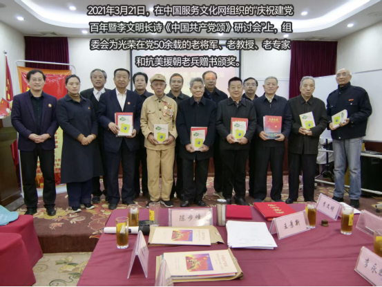 (2021年3月21日,在“庆祝建党百年暨李文明长诗《中国共产党颂》研讨会”上,组委会为光荣在党50余载的老将军、老教授、老专家和抗美援朝老兵赠书颁奖。陈步峰赋诗点赞康殿英先生的创新贡献)