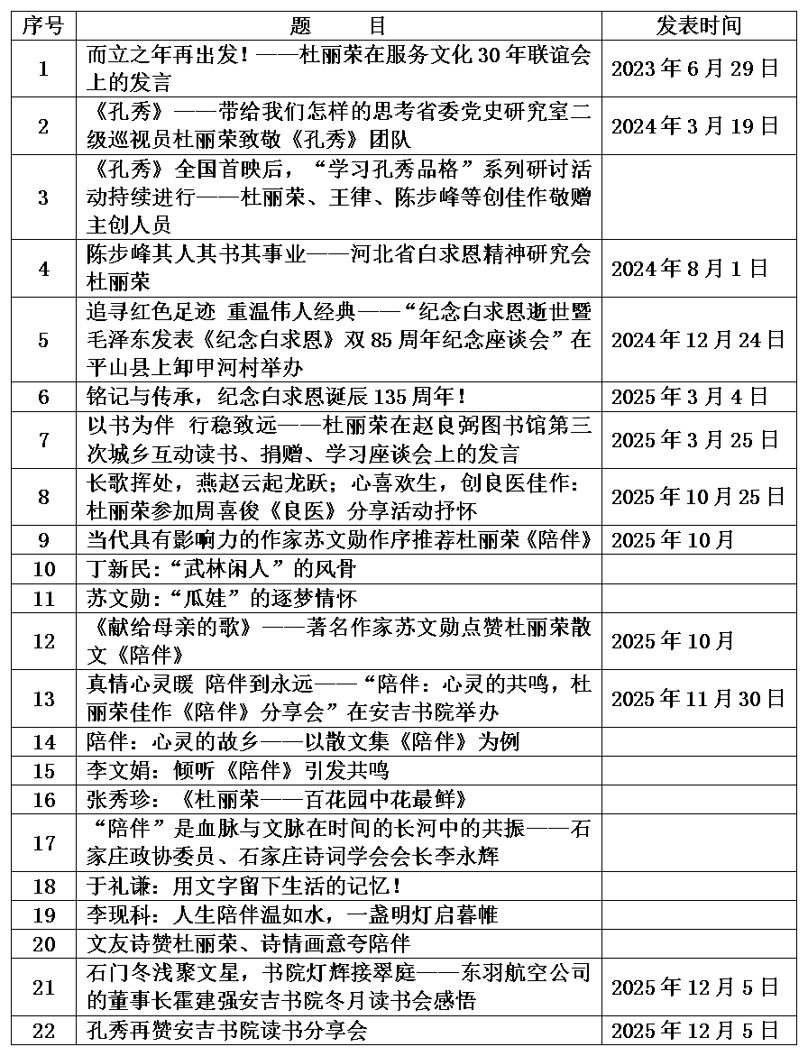 编者按:为了学习贯彻习近平文化思想,弘扬先进文化,传承中华美德;为了举旗帜、聚民心、育新人、兴文化、展形象,繁荣文学创作,讲好河北故事,强化文化自信自觉;为了促进全民阅读、共创共享和美生活。2025年11月30日,“陪伴:心灵的共鸣——杜丽荣佳作《陪伴》分享会”在安吉书院陈步峰服务文化工作室成功举办。