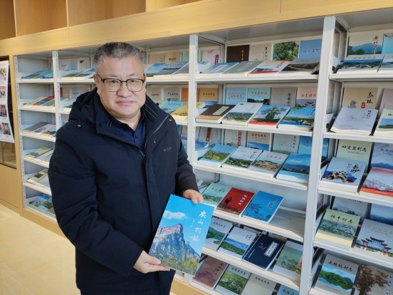 (刘锋在赞皇县图书馆向与会嘉宾介绍他主编的《尖山村志》)