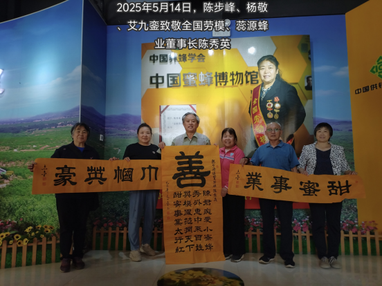 陈步峰讲:陈秀英是以“甜蜜事业”带动当地农民脱贫致富的著名的养蜂专家,是以“小蜜蜂”撬动“大产业”的女性创业的典范。在推动养蜂产业规模化与标准化;打造自主品牌,拓展市场渠道,带动脱贫攻坚与乡村振兴;传承蜜蜂文化与科技赋能等方面做出了有益的探索,闯出了一条脱贫致富乡村振兴的新路。是令人敬重的太行凤范、燕赵骄傲,是赞皇县和我们陈姓大家庭的荣耀。我曾带队来过多次,每次都感受震撼受益匪浅。也有感而发的撰写了《陈君痴爱小蜜蜂 甜蜜事业太行红——蕊源蜜蜂博物馆已成为大美赞皇绿色太行的靓丽名片》《筚路蓝缕40余载 创出甜蜜事业来——陈秀英以感恩的心态执着的酿制甜蜜生活》《筑蜂巢式支部 做蜜蜂式党员——辛集商会、瀛冀律所和孔秀团队的党员们在蕊源蜂业党建展室重温入党誓词》等系列文章。昨晚听说陈总再获殊荣。立即创作对联,请二中教师彭秀平连夜创作出对联:“太行深处,蜂舞枣林,酿得千家甜蜜;巾帼肩头,志牵乡梓,铺就万里富途。”