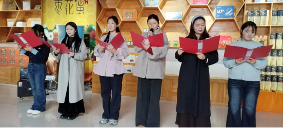赞皇县北马村小学刘艳欣、赞皇县医院杨文霞和赞皇县第三中学赵艳萍、马子贤诵读了郭朝辉创作的《奋斗无限美 巾帼竞风流》。赞皇县市场监督管理局职工吕聪蕊、李泽璐、崔珂玮、田方园、王若雨、张勤雪合唱了《祖国不会忘记》,教育系统职工米兴、张雅宁带来爵士舞蹈《红日》《再嘉》。赞皇县第三中学马子贤、王雨欣、王若凡、李佳平和赞皇县总工会社会实践大学生潘文丛、臧铄晗,带来了唐诗宋词元曲等经典诵读。她们诵读了李白的《宣州谢朓楼饯别校书叔云》、王勃的《仲春郊外》、李清照的《一剪梅》、张九龄的《感遇》、曹植的《洛神赋》、王昌龄的《采莲曲》、崔护的《题都城南庄》、杜牧的《赠别》、秋瑾的《休言女子非英物》、舒婷的《致橡树》、苏轼的《定风波·莫听穿林打叶声》、张若虚的《春江花月夜》。同时,通读了《春风》《春雨》《春山》《春水》的经典诗词,大力宣传了嶂石岩山那边高端民宿、长寿岛康养旅游度假区,大力宣传了赞皇县蜜蜂谷的大美风光和赞皇县天源蜂业农业专业合作社一二三产业融合发展的产业魅力,